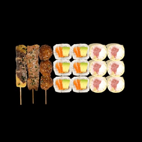 1 brochette bœuf fromage, 1 brochette poulet,1 brochette boulette poulet, 6 california saumon avocat, 6 egg roll saumon cheese, avec riz, soupe, salade de chou.